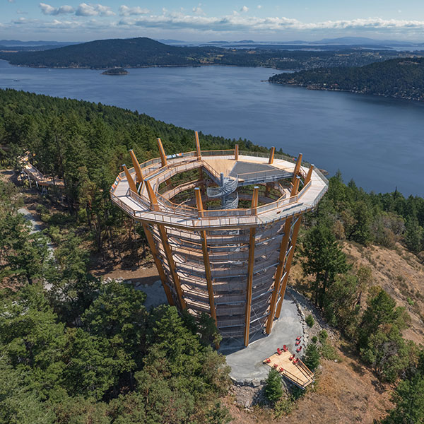 - Sightseeing Lookout: At the top of the tower, guests are 250 m (820 ft) above sea level and enjoy 360-degree views of islands, inlets, fjords, forests and mountains in two countries. Landmarks include Finlayson Arm, Saanich Inlet, Saanich Peninsula, Gulf Islands, San Juan Islands, Mt. Baker and the Coast Mountain range.